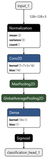 Transfer learning is a popular approach in DL, where a pretrained model is reused as the starting point for a model on a second task []. This allows the user to rapidly deploy complex neural networks, including state-of-the-art DL architectures without incurring time and computing costs. In this study, transfer learning was performed using VGG networks [], residual networks (ResNets) [], InceptionV3 [], Xception [], and densely connected CNNs (DenseNets) [] pretrained on the ImageNet dataset. These networks were implemented in Keras as a base model using the provided Keras API with the following parameters: weights = “imagenet”, include_top = False and input_shape = (128, 128, 3) (Figure 6). Output from the base model was joined to a global average pooling 2D layer and connected to a final dense layer, with the activation function set as either “sigmoid” for image classification or “linear” for image regression. The model was compiled with the batch size as 32, optimiser as “Adam”, and corresponding loss functions and evaluation metrics as described in Section 2.4.2. Model training occurred in two stages for both image classification and regression tasks: in the first stage (100 epochs), weights of the pretrained layers were frozen, and the Adam optimiser had a higher learning rate (1 × 10−1 or 1 × 10−2) to allow faster training of the top layers; in the second stage (200 epochs), weights of the pretrained layers were unfrozen, and the Adam optimiser had a smaller learning rate (1 × 10−2 to 1 × 10−5) to allow fine-tuning of the model. Learning rates were optimised for each CNN and the values that provided the best model performance are provided in Table 1. Performance of the trained models was evaluated on their respective test datasets (Section 2.4.4).