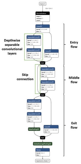 An eight-layer mini Xception model with 207,560 parameters was the best architecture discovered in 50 and 100 trials. Three main parts (entry, middle, and exit flows) and two key features (indicated by green boxes), namely the depthwise separable convolutional layers and skip connections from the original Xception network [] can be discerned. The best performance was provided by the model from 100 trials.