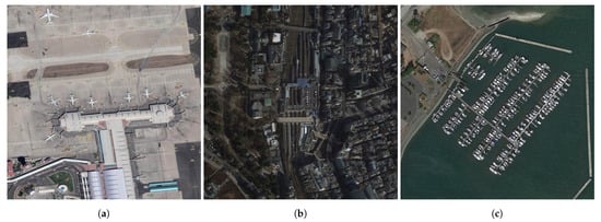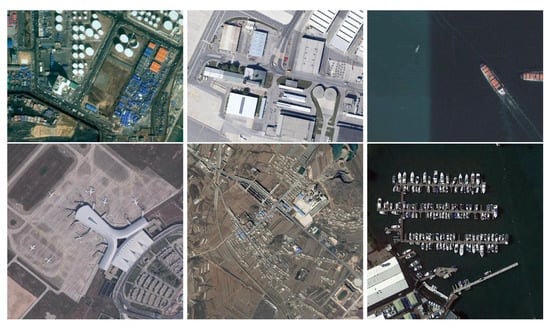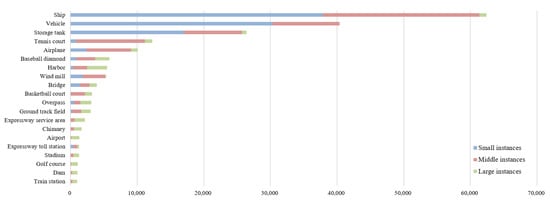 DIOR: DIOR [] is currently the largest optical remote sensing dataset. As shown in Figure 6, it contains 23,463 images and 192,472 instances, covering 20 object classes. The size of images in the dataset is 800 × 800 pixels and the spatial resolutions range from 0.5 m to 30 m. The dataset has a large range of object size variations, not only in terms of spatial resolution, but also in the aspect of inter- and intra-class size variability across objects. For example, most instances of ships are small object whose size is smaller than 30 × 30 pixels, while most instances of train stations are large that have a size bigger than 150 × 150 pixels. For small objects such as oil tanks or ships, there are great numbers of scenes that have numerous instances. There are images with complex background in DIOR, making the dataset even harder. Moreover, the data show a long-tailed distribution, that is, some classes such as Ship have mass instances, while other classes such as Train station have few targets. This is a challenge to the generalization performance of the detection method.
