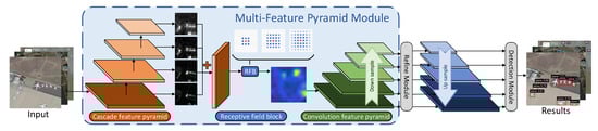 Figure 2 shows the structure of the Multi-Feature Pyramid Network (MFPNet). The MFPNet is proposed to solve the problems of scattered distributed objects, complex backgrounds, and scale difference between classes. These problems may also exist in general object detection, but they are more significant in ORSIs. The size of the same object at different resolutions may vary greatly, so most approaches are only effective on a specific dataset. Our target is to promote the robustness of the method. As concluded in Section 2, feature pyramids and receptive fields can make significant promotion for optical remote sensing object detection. Thus, multi-scale features are adopted in our method. In order to ensure that the network can cover semantic information from shallow layers to deep ones, a cascaded feature pyramid is constructed in the VGG16 backbone and a cascade method is used to merge the features of different layers to highlight the features of small objects. Then, the RFB is used to extract the local context information from the cascaded feature layer. Dilated convolutions are used to ensure the rotation-invariance. Finally, the second convolution feature pyramid is built to propose multi-level anchors. Two detection modules are used to improve the regression and classification of the final bounding box. VGG16 is adopted as the backbone to ensure the real-time performance. In the following parts, we will introduce the network from three aspects: (1) Multi-Feature Pyramid Module; (2) Receptive Field Block; (3) Double-Check Detection Network Module.