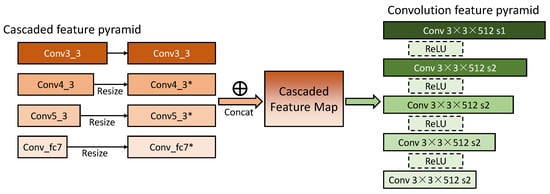 Since the scale of objects in the ORSIs varies greatly, it is necessary to combine features of different levels for detection. To solve the stated problems of ORSIs, the multi-scale method is adopted, which lead to the concept of the Multi-Feature Pyramid Module (M-FPM). The main architecture of the M-FPM consists of two parts. A cascaded feature pyramid and a convolution feature pyramid. In the first cascaded feature pyramid, Convolution Layer (Conv)3_3, Conv4_3, Conv5_3 and Conv_fc7 in VGG16 are extracted as four source feature layers. The extraction of the feature layers refers to YOLO-v3 []. Though the max pooling strategy reduces the number of parameters and enhances the global feature, the local features are also suppressed. The cascade strategy can make up for this loss. Most objects in ORSIs are small and scattered, so local features need to be preserved as much as possible. Thus, the pyramid start with Conv3_3 (of 80 × 80 pixels) with rich local features. Conv4_3 (40 × 40), Conv5_3 (20 × 20) and Conv_fc7 (10 × 10) are, respectively, upsampled to the same size as Conv3_3 to obtain the cascaded feature map. This feature map contains both the global and local features, which allows us to extract features using the RFB. It also enriches the features on different scales. Details of the local and global features extracted by the cascaded feature pyramid are shown in Table 1. After obtaining the cascaded feature map, we use stride convolution to construct the convolution feature pyramid. The structure of the M-FPM is shown in Figure 3.