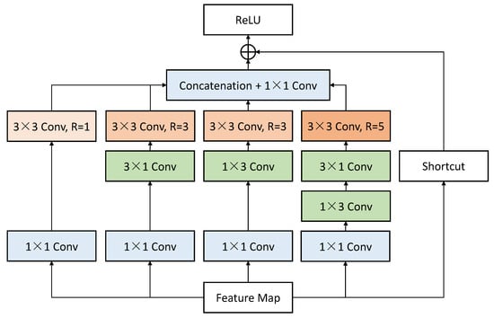 Receptive field refers to the area where the convolution kernel can extract information in the feature map. Receptive Field Block is a module that can obtain local context information. In order to simulate the various receptive field sizes of the human eye, the block is designed with a variety dilated convolution with different expansion rate, which can increase the receptive field of convolution while reducing the information loss caused by the operation of max pooling. As shown in Figure 4, for the incoming cascaded feature map, the block first constructs a bottleneck structure using 1 × 1 convolution to reduce features, and then performs convolutions with different kernel size. Asymmetrical convolution kernels like 1 × 3 and 3 × 1 are used to introduce more nonlinear transformation as well as save computational consumption. Dilated convolutions with different expansion rate are then performed to simulate multi-scale receptive field. Finally, the results of the four different branches are integrated and sent into the next layer. The Receptive Field Block is created to help the network generating higher resolution feature maps for local context information and improving the accuracy of object detection. Details of the local context features in RFB are shown in Table 2. The resolution and dimension of the feature map remains the same after concatenating the output of these four branches. Compared with methods using classical receptive field, our operations on the receptive field act on the cascaded feature map, including the context information in different scales.