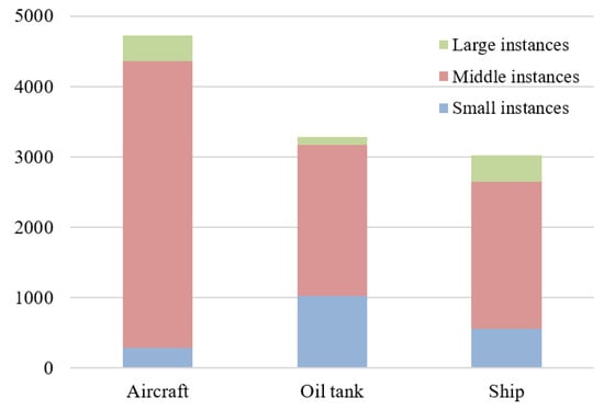 Levir: Levir [] is a small-scale remote sensing dataset, but it contains small objects in ORSIs, so it is suitable for small and medium scale object detection. Levir contains 3791 high-resolution Google Earth images. The image size of the dataset is 800 × 600. Levir covers most types of environments in ORSIs, such as cities, villages, mountains and oceans. Three types of objects are labeled in the dataset, including aircrafts, ships and oil tanks. There are 11,000 labeled independent objects in total. Although the number instances is relatively small, the categories of targets are common in detection of ORSIs. So Levir is a dataset suitable for verifying the feasibility of the method. The scales of the instances range from smaller than 30 × 30 pixels to larger than 150 × 150 pixels, which is a hard task for a classical detector. The number of instances in the dataset is shown in Figure 5. Numbers of objects with various scales are shown in different color.