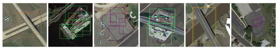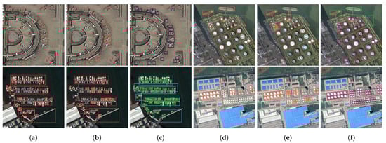 The input size of images will affect the detection accuracy. Many researchers [,,] have proved that the greater the size of the input image, the detection of small objects will be more friendly, and the detection results will tend to be better, especially for the large number of small objects in the ORSIs. Using a lower input size 320 × 320 (due to insufficient computing resources, we are unable to test 512 × 512 inputs. However, through experience, we believe that the detection accuracy of the larger input will be much higher), MFPNet is capable of generating 89.8% mAP, exceeding all current one-stage and two-stage methods. The input size of these methods is greater than or equal to ours, which proves that our network has favorable performance on the detection of small objects in ORSIs. The results on Levir dataset is shown in Figure 8, Figure 9 and Figure 10.