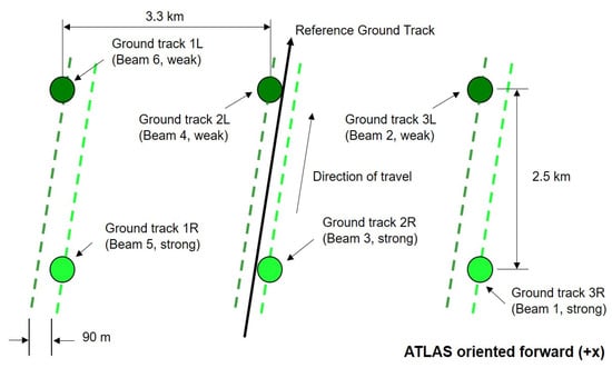 Schematic diagram of laser footprints of the Ice, Cloud, and land Elevation Satellite-2 (ICESat-2) on the ground in the forward orientation. The laser beam pattern is a 3 × 2 array in which one strong beam and one weak beam are grouped into a pair. When advanced topographic laser altimeter system (ATLAS) is oriented in the forward orientation, the weak beams are on the left side of the beam pair and are associated with ground tracks 1L, 2L, and 3L. When ATLAS is oriented in the backward orientation, the relative positions of weak and strong beams change, and the strong beams are on the left side of the ground track pairs and lead the weak beams [40]. The distance between each pair was approximately 3.3 km. In the same pair, the interval between the strong beam and the weak beam was 2.5 km. The cross-track distance between the two ground tracks in the same pair was 90 m.