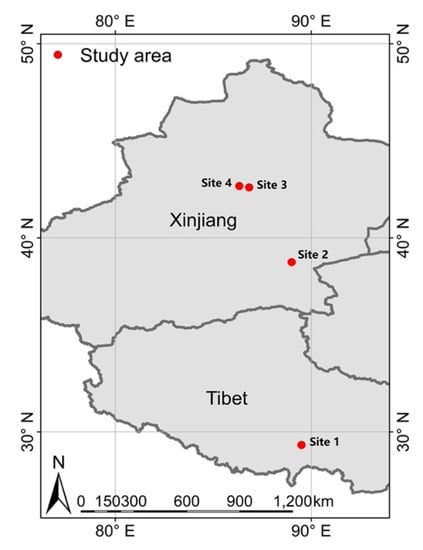 Four mountainous areas were chosen in this study to verify the performance of the modified method, which was also compared with the classical method and the standard results from the ATL03 and ATL08 datasets. The first study area was near Xigaze City in the Tibetan Plateau and ICESat-2 flew over this area in December 2018. The second study area was in the Altun Mountains in the Xinjiang Uygur Autonomous Region, China, and ICESat-2 flew over this area in September 2019. The third and fourth study areas were in the eastern part and western part of the Tianshan Mountains, China, and ICESat-2 flew over these areas in February 2019 and in June 2020, respectively. The geographical locations of the four study sites are shown in Figure 2. According to the land-cover types from the GLOBELAND30 product in 2020 (http://www.globallandcover.com/home.html?type=data, accessed on 9 September 2018), in the four study areas, the bare-land and grassland were the dominant land-cover types. In addition, surface water (e.g., rivers in valleys) and snow (normally on the ubac slope in winter) were also observed from the Sentinel-2 image that was captured along the ICESat-2 tracks. The acquisition time of the Sentinel-2 image was close to that of the ICESat-2 data in each study area. Note that Sentinel-2 images were only used to show the along-track surface types or environmental information. The environmental information of the four study areas and the descriptions of used data are listed in Table 1.