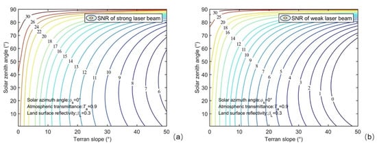 Theoretical signal–noise ratio (SNR) contours for the ICESat-2 strong and weak beams under different environmental conditions. (a) SNR corresponding to the strong laser beam, and (b) SNR corresponding to the weak laser beam. The solar spectral irradiance was set as 1.83 W/m2∙nm at the wavelength of 532 nm in calculation. The values of σh and Var(ξ) were both set as 0 because they had relatively weaker impacts on SNRs than the surface slopes and solar zenith angles.