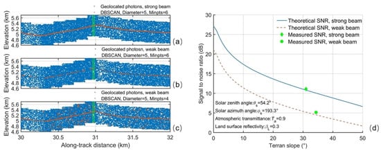 Measured geolocated photons in an ICESat-2′s along-track segment in the first study area (i.e., ATL03_20181207065658_ 10640102_002_01, GT1R) and the SNR curves for the strong and weak beams. (a) Measured noisy geolocated photons (blue points) and the detected signal photons (red points) for the strong beam with the Minpts of 6. The x-axis represents relative ICESat-2 along-track distance and the y-axis represents the ellipsoid height in kilometers. (b) Measured noisy geolocated photons and the detected signal photons for the weak beam with the Minpts of 6. (c) Measured noisy geolocated photons and the detected signal photons for the weak beam with the Minpts of 4. (d) Theoretical SNRs of the strong beam (using blue solid curve) and the weak beam (using red dashed curve). In (d), two typical SNR values are marked by green points and were calculated by the measured signal and noise photons in the green boxes in (a,b) for the strong and weak beams, respectively.