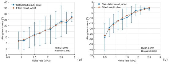 As above-mentioned, the signal photons of the strong beam can be well detected and used to calculate the along-track slope σL and the same environmental parameters were used for both beams in the same pair. Therefore, the slope–noise relationship can be fitted by the strong beam of a pair and then be used to inverse the along-track slope of the weak beam according to its noise rate. Using a full track of strong beam data (i.e., the ATL03_20181207065658_10640102_002_01, GT1R), Figure 7a,b illustrates the fitting result for the adret and ubac sides, respectively.