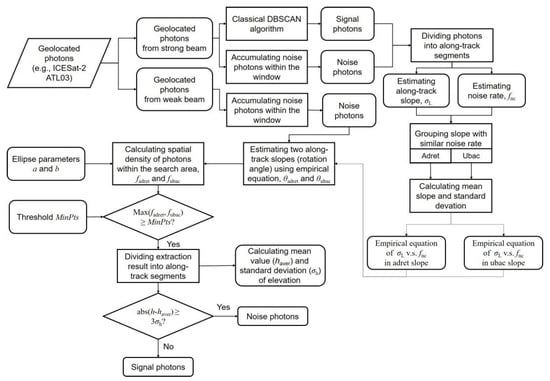 Based on the analysis in the last section, the empirical slope–noise equation between the along-track slope and the solar-induced background noise provides a feasible way to directly estimate the rotation angle θ using Equation (8). For the DBSCAN method, the other three parameters (the major axis and minor axis of the elliptical neighborhood and the Minpts) can be calculated based on the system parameters and the measured data. In this study, a modified DBSCAN method was proposed to detect the signal photons from weak beam data measured in mountainous areas referring to the available information from the strong beam in the same pair. The flow chart of the extracting procedure is illustrated in Figure 8. Supplement Materials are available in this paper, i.e., a demo of the algorithm code based on MATLAB and its future update are available online at https://github.com/Futurewhu/ATLAS_WEAKBEAM_PROCESS, accessed on 9 September 2018.