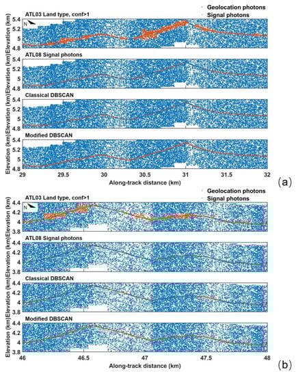 As shown in Figure 10, the blue points correspond to measured geolocated photons from the ATL03 dataset and the points marked with red are the signal photons extracted by different methods. The along-track slope exceeded 30° in many sub segments (e.g., at the distance from 29.5 km to 30.7 km in Figure 10a as well as from 46.2 km to 46.6 km in Figure 10b. At steep slopes, the extraction results showed significant differences. The extraction result based on the confidence level from the ATL03 dataset mistakenly classified many noise photons as signal photons. Moreover, several breakpoints existed (i.e., many signal photons are missed), for example, near 31 km, which corresponded to the largest slope as in Figure 10a. For the classical DBSCAN method, it had to increase the threshold value (i.e., Minpts) to refrain from a massive amount of noise photons that were wrongly classified as signal photons, but it simultaneously made the extraction result inconsecutive in steeper areas, which was similar to the results from the ATL08 product. In the other three study areas, comparisons similar to those in Figure 9 and Figure 10 were conducted. The figures of the other three study areas are shown in the Appendix A. Specifically, the background noise of the fourth study area was the strongest because the ICESat-2 data were measured in summer. In the second study area, the terrain slopes in some along-track segments were close to 40°, which makes extracting signal photons more challenging. Some snow was found in the third study area in late winter. In the comparisons of the result figures in the four study areas, the modified DBSCAN produced smoother and continuous terrain profiles.