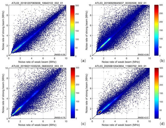 For the four study areas, the ATL03 background noise rates of the strong beam and weak beam in the same pair are illustrated in Figure 11a–d, respectively. It should be noted that the background noise rates of the strong beam and weak beam were adjusted to the same start latitude in Figure 11. The coordinate interval in Figure 11a–d was evenly divided into small grids with an interval of 0.05 MHz. The background noise rate of each 50-shot segment was placed into each grid, and the color in each grid indicates the actual number of the background noise rates that fell within the current grid. The statistical results in Figure 11 demonstrate that the RMSE of background noise rates from the adjacent strong and weak beams was lower than 0.9 MHz, and the correlation coefficient of the background noise rates from these two beams was higher than 0.9. As result, the environmental conditions of the laser beams in the same pair (i.e., the atmospheric transmittance, the surface reflectivity, and the terrain slope) can be assumed to be nearly identical. Actually, the embedded data processing in the ATL03 product also use similar assumptions (i.e., environmental conditions calculated from the neighboring strong beam data were used in the data processing for weak beam data) [43].