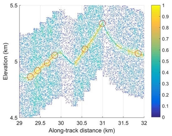 Taking the captured photons in the first study area as an example, Figure 12 illustrates the normalized spatial density of the used data in Figure 10a and indicates why the classical DBSCAN method and its modified self-adapting version failed to extract signal photons from the weak beam data in mountainous areas. First, the noise rates sharply fluctuated in different along-track segments (e.g., at the ridge near the segment of 31 km). The spatial density of noise photons at the adret slope (in the segment of less than 31 km) was very close to that of signal photons at the ubac slope (in the segment of larger than 31 km). As a result, the fixed threshold of spatial density cannot detect the signal photons at the ubac slope and discards the noise photons at the adret slope at the same time. Second, the spatial density at vertical direction is higher than that along the terrain profile (e.g., the locations marked with red circles in Figure 12). A method that rotates the searching neighborhood to the direction of the maximum spatial density would also fail to distinguish signal photons from the noise photons. As a result, it is necessary to import the available information to determine the direction of the searching neighborhood (e.g., the noise-slope relationship in this paper).