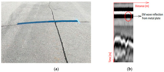 (a) Metal plates; (b) electromagnetic (EM) wave reflection on radargram.