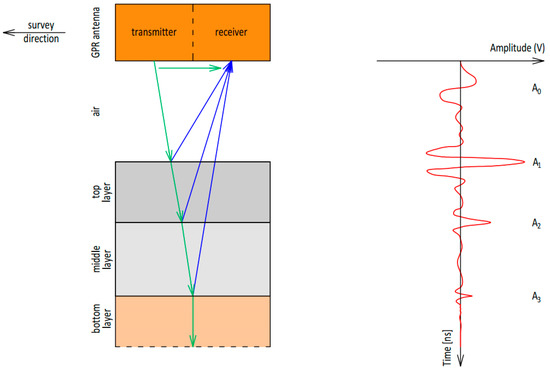 EM waves have larger amplitudes at the boundaries between layers (Figure 4), and this amplitude depends on the dielectric constant of each layer. The greater the difference in dielectric constant between layers, the greater the amplitude of the reflected EM wave. The dielectric constant ranges from 1 for air (vacuum) to 81 for water. For road construction materials, the dielectric constant ranges from 2 to 30 [29]. For air-coupled antennas, the surface reflection method is used to calculate the dielectric constant of the layer. In this method, a metal plate is used because the metal plate completely reflects the EM waves so that the amplitude of reflection is maximum [28,30]. Since the dielectric constant of air is known, the dielectric constant of the top layer can be calculated according to Equation (4):