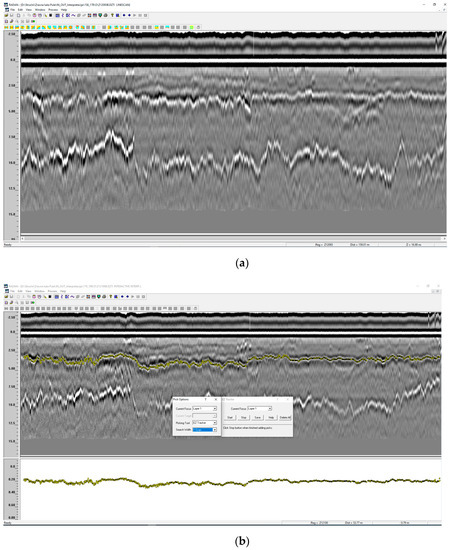 The processing and interpretation of the collected GPR data were performed in RADAN 6.6 software in accordance with [31]. In the processing stage, the raw GPR data were combined with the calibration data collected over a metal plate to obtain processed data. This step was necessary to compensate for the antennas bouncing during the data collection, adjust the time-zero correction and calculate the velocity of the GPR signal. The reflections of the EM waves at the different layer boundaries within the pavement were visually identified in the radargram (Figure 5a). Discontinuities and larger dielectric contrasts between media imply more prominent reflection. As shown in Figure 5a, a continuous strong reflection defines an obvious interface between air and asphalt layers and the asphalt layer and unbound base layer. The layer depth was determined by manually controlled semiautomatic interpretation based on finding the nearest peak. The results are shown in the depth and distance diagrams for each measurement line (Figure 5b).