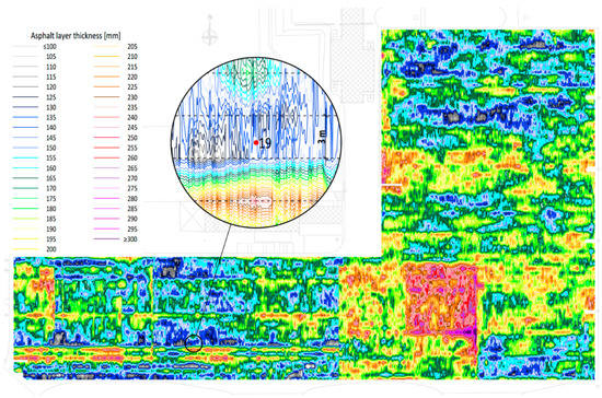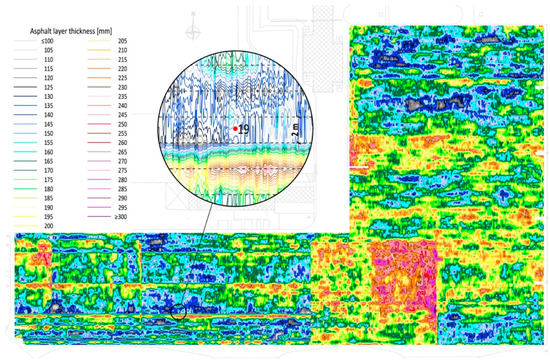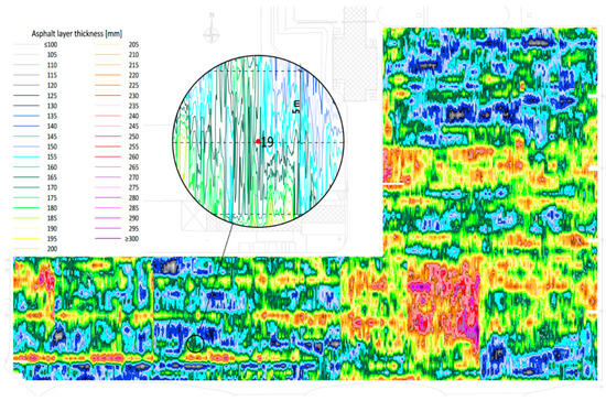 3D models of asphalt layer thickness can be displayed on contour maps or maps with bands. The different ways of representing asphalt layer thickness allow researchers and designers to better determine homogeneous areas, which is important for the proper selection of pavement rehabilitation technology. Specialized software allows the representation of 3D models with contours with different equidistance values and bands with different ranges of layer thickness. In this research, the division of the bands into ranges of 50 mm was chosen. This division of the bands allows the analysis of the existing pavement structure with sufficient accuracy and allows the possibility to choose the optimal rehabilitation solution. It should be emphasized that such a division of the bands is particularly important when there is no possibility to change the vertical alignment of the surface to be rehabilitated. Two cases should be distinguished. The first case concerns pavements with a total thickness of asphalt layers greater than the thickness of the newly planned layers. In this case, when the portion of existing layers are milled off, a certain minimum thickness of them must remain (50 mm). If the bands are created with a range of 50 mm, it is possible to estimate the area with a thickness of asphalt layers smaller than the specified 50 mm. On such areas it will be necessary to completely remove the asphalt layers and rehabilitate the subgrade. The second case relates to the asphalt overlay on the concrete pavement, which is usually made of the asphalt concrete AC 16 surf type with a minimum technological thickness of 42 mm. In practice, the thickness of this layer is usually 50 mm. If the thickness of the existing overlay is less than 50 mm, bands with a range of 50 mm provide information about the need to remove part of the concrete pavement.