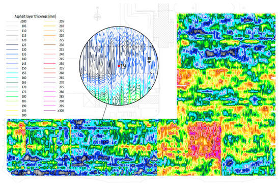 As expected, the comparison of the measured distances and the relative errors of the model showed that the relative error of the model increases with increasing distance between the core and the survey line (Table 3). However, the largest relative error, 24.2%, was not registered at the farthest core, but at core 19, which was 1.09 m away from the survey line in the MC3 and MC4 models. The most distant core 10 (model MC5) showed a relative error of 12.5%. Since the largest error of the model was not recorded at the furthest point, other influencing factors that may have affected the error occurring at core 19 were considered. It was found that within a 3.0 m radius of Core 19, there is a significant variation in asphalt layer thickness from 120 to 225 mm (Figure 8, Figure 9, Figure 10, Figure 11 and Figure 12).