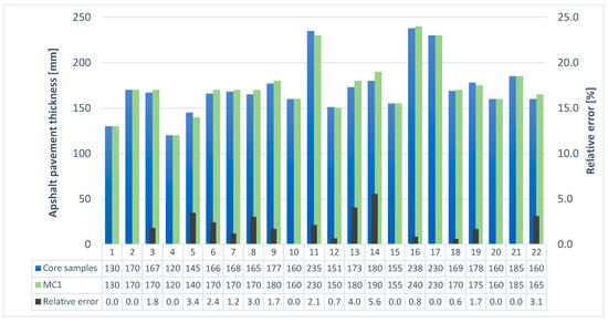 Model MC1—asphalt layer thickness and relative error in the core locations.
