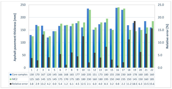 Model MC2—asphalt layer thickness and relative error in the core locations.
