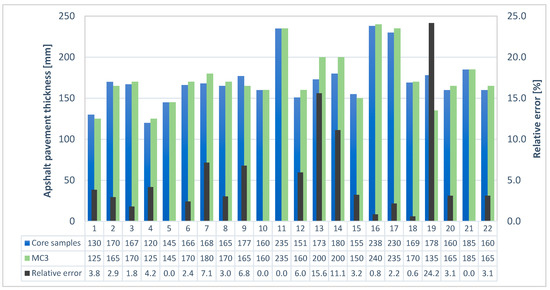 Model MC3—asphalt layer thickness and relative error in the core locations.