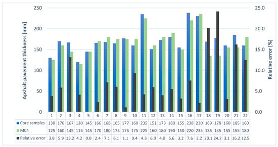 Model MC4—asphalt layer thickness and relative error in the core locations.