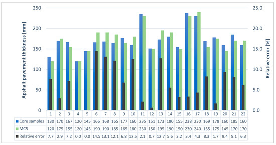 Model MC5—asphalt layer thickness and relative error in the core locations.