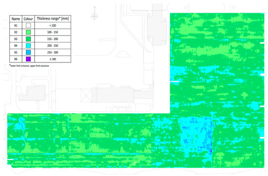 Contour maps provide a detailed representation of asphalt layer thickness and allow determination of model accuracy but are not suitable for defining homogeneous areas used in selection of rehabilitation technology. Maps with bands are more suitable for defining homogeneous areas because the bands represent the pavement area with a specific range of asphalt layer thickness. Six bands (Table 4) were defined to determine the effect of the number of survey lines on the size of the homogeneous areas on each of the five 3D models (Figure 18, Figure 19, Figure 20, Figure 21 and Figure 22). Band B1 includes all asphalt layer thickness values less than 100 mm. Bands B2–B5 include thickness values from 100 to 300 mm, with each band being 50 mm. Band B6 includes all asphalt layer thickness values greater than 300 mm.
