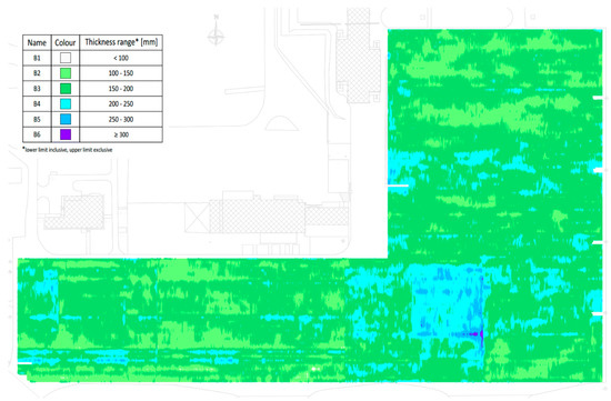 Of course, it is possible to make divisions in bands with a smaller range, but such a choice is suitable for smaller areas where there are significant variations in the thickness of asphalt layers. Finer division, e.g., the range of 10 mm, leads to many homogeneous areas with smaller dimensions (smaller share in the total area of the apron, large scatter).