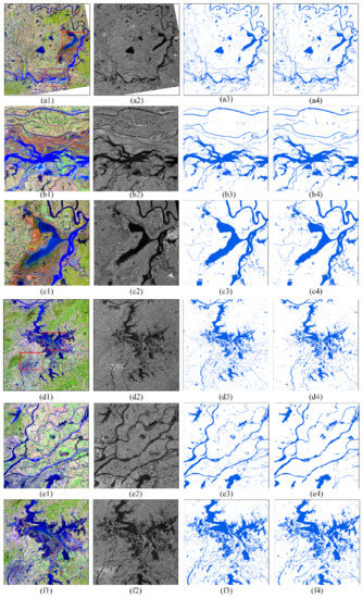 - Tang, D.; Wang, F.; Xiang, Y.; You, H.; Kang, W. Automatic Water Detection Method in Flooding Area for GF-3 Single-Polarization Data. In Proceedings of the 2018 IEEE International Geoscience and Remote Sensing Symposium, Valencia, Spain, 22–27 July 2018; IEEE: Piscataway, NJ, USA, 2018; pp. 5266–5269. [Google Scholar] [CrossRef]