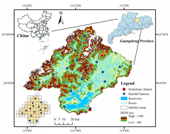 The Xinfengjiang River is located in the southern mountainous area of China, which is a subtropical monsoon climate zone with a mild climate, abundant sunshine and abundant rainfall (Figure 1). The XRRB catchment is selected as the research area in this study, and it has a watershed area of 5734 km2 above the Xinfengjiang Hydraulic Power Station. The dam site is located in Heyuan city, Guangdong Province, 9.2 km away from the mouth of the Xinfengjiang River.