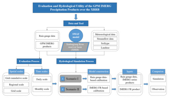 This study is divided into two parts. The aim of the first part (precipitation product evaluation) is to evaluate the accuracy of the IMERG series products on daily and monthly scales in the XRRB. Moreover, the IMERG series products over the XRRB are also statistically analyzed in terms of three spatial scales: grid cumulative scale, basin scale, and grid scale. For the grid cumulative scale, the evaluation is performed by accumulating data for all times and all grids into the same sequence. For the basin scale, the average precipitation of each time point in the research region is incorporated, and the evaluation at the basin scale considers the mean precipitation in the basin. In regard to the grid scale, the spatial distribution characteristics of rainfall events for each product in each grid and indexes are explored. From this, accuracy validation can be conducted using the total data along with evaluations of a single grid, so that a comprehensive comparison between each precipitation product and observed values is achieved [19,20,21]. In the second part (runoff simulation evaluation), the SWAT model is used to construct a hydrological model of the XRRB based on two scenarios. In Scenario I (the SWAT model calibrated by rain gauge data), the ER, LR, and FR products are subsequently used to run the model with the same parameter values in the calibration period. In Scenario II (the SWAT model calibrated by the FR), the FR product is also utilized for validation to explore the potential application of satellite data to areas with little information. Both scenarios are modeled on the daily and monthly scales. The four precipitation products are used to drive the hydrological model. The main idea and procedure of this research are illustrated in Figure 2.