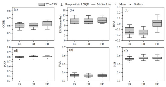 As shown in the box plots at the daily scale, several outliers associated with PODs (Figure 3d) are found in the three products. By reviewing the original data, we find that the outliers in the POD results come from the same station. Meanwhile, the RMSE and Bias results associated with this station are not notably different from those associated with other stations. Hence, we modestly conclude that some small precipitation events are not fully captured in this grid by the GPM. Despite this, the POD results still indicate that the IMERG products deliver better performance compared with other satellite-based precipitation products [5]. The retrieval algorithms of GPM sensors have received considerable improvement, while the Core Observation platform is equipped with the world’s first dual-frequency precipitation radar (DPR; Ku band at 13.6 GHz and Ka band at 35.5 GHz) [43]. In addition, as illustrated in Figure 4, outliers can also be found in the RMSE results of FR. By checking the original data, we discover that the outliers in the RMSE results also come from the same station, and they may be mainly caused by the fact that more heavy events happened at this station, leading to larger error magnitudes and RMSEs, because RMSE tends to amplify larger errors. Actually, the values of these outliers are also within the acceptable error range, hence they can still offer valuable spatial rainfall information in the next step of runoff simulation.