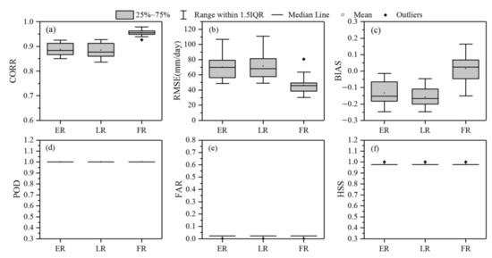 Analyses of the accuracy of the IMERG series of products on the grid scale and all the metrics are included in Figure 3 and Figure 4. The box plots of the accuracy metrics on the daily scale (Figure 3a–c) show that the CORR and BIAS of the FR product (median: CORR of 0.62, BIAS of 0.02) are superior to the ER (median: CORR of 0.60, BIAS of 0.15) and LR (median: CORR of 0.60, BIAS of 0.17). The RMSE metrics results have values that are close to each other. All three IMERG products perform satisfactorily in terms of detection capability and the three metrics all have similar values (Figure 3d–f). The three IMERG products all contain a few outliers with PODs (Figure 3d). From the box plots of the accuracy indicators of each product at the monthly scale in Figure 4, the CORR, RMSE, and BIAS results (Figure 4a–c) show that the FR values (median: CORR of 0.96, RMSE of 45.74, BIAS of 0.02) are more accurate than the ER (CORR:0.88, RMSE:67.99, BIAS:0.15) and LR (CORR:0.88, RMSE:69.856, BIAS:0.17) values. Note that the CORRs and RMSEs of FR, as shown in the box plots of (Figure 4a,b), are distributed in a narrower range than those of ER and LR, indicating the lower uncertainty of the near-real-time products. All three IMERG products perform satisfactorily in terms of detection capability (Figure 4d–f). Overall, the conventional indicators show the advantage of the post-real-time FR. The IMERG products show similar performances in terms of the detection effects. All the metrics improved as the temporal resolution changed from daily to monthly at the grid accumulation scale and basin and grid scales.