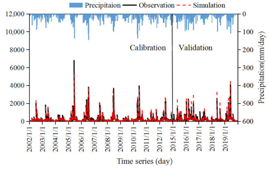 Comparison of observed and simulated hydrographs using daily rain gauge data during the calibration period and validation period in the XRRB (Scenario I).