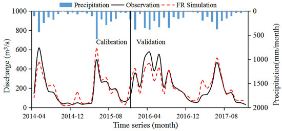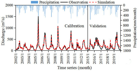 Comparison of observed and simulated hydrographs using monthly rain gauge data during the calibration period and validation period in the XRRB (Scenario I).