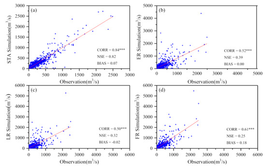 Scatter plots of daily simulated streamflow driven by (a) STA, (b) ER, (c) LR, and (d) FR against the corresponding observed streamflow (***: p < 0.001).