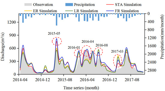 With regard to the results at the monthly temporal scale, the monthly observed and simulated streamflows driven by the four precipitation inputs (STA, ER, LR, and FR products) for the validation period are shown in Figure 9 and Figure 10. The simulated runoff curves for the STA, ER, LR, and FR products are generally consistent with the observed streamflow curves, especially for FR, which has a CORR of 0.87, a value that is much higher than that of ER (0.73) and LR (0.71). The NSE values of all three IMERG products are in the range of 0.69–0.72. The BIAS of FR (0.26) is significantly overestimated, much higher than ER (0.07) and LR (0.04). Similar to the significance test results reported in 4.1, the simulation results based on ER, LR and FR also exhibit significant differences under the t-test at the 95% confidence level. Overall, the IMERG series products have better simulations at the monthly scale than at the daily scale. Compared with the two near-real-time products (ER and LR), the simulations driven by the FR show better performance in hydrological applications. As seen from Figure 8, the markers (May- 2015, March-2017 and January-2016) show that the FR simulation is closer to the STA simulation than ER and LR simulations, which indicates the advantage of the post-real-time FR product. However, it is also necessary to note that all four products (STA, ER, LR, and FR) showed higher simulated flows than observations (the locations marked in May-2015, January-2016, October-2016 and March-2017), which may be related to measurement error in discharge.