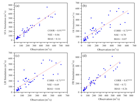 Scatter plots of monthly simulated streamflow driven by (a) STA, (b) ER, (c) LR, and (d) FR against the corresponding observed streamflow (***: p < 0.001).