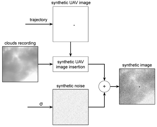 The use of real UAV sequences makes it difficult to analyze the algorithms because it is necessary to collect a very large number of video sequences for various conditions. This limits the ability to test algorithms. It is more effective to use sequences with combined UAV, background, and noise image. This makes it possible to control the trajectory of the UAV and the level of image noise. Additive Gaussian noise is controlled by the (standard deviation) parameter. The image-merging process is shown in Figure 2.