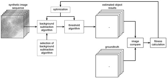The full pipeline was used in the selection phase of the background estimation algorithm and its parameters as well as threshold value. In the normal operation phase, the selected algorithm was applied and the parameters of the background estimation algorithm as well as threshold were fixed. This means that the block “selection of background subtraction algorithm” is fixed and is not controlled by the optimization algorithm. The input images were 8-bit coded (grayscale), and the image after thresholding was a binary image.