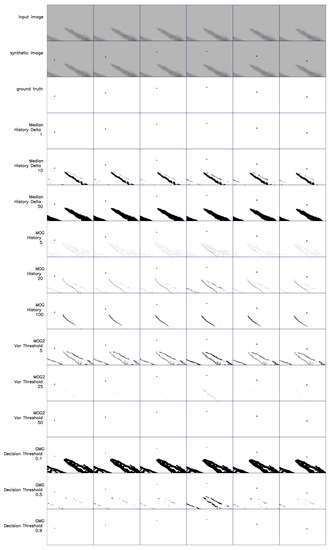 The problem of choosing the background estimation algorithm is related to the choice of parameters. Their selection affects the quality of the estimation, but it depends on the type of data, which makes manual selection by trial and error practically impossible. These parameters, although independent of each other according to their names, can create complicated relationships with each other, which complicates the search for the optimal configuration. Due to the large number of background estimation algorithms, selection of the optimal variant is a serious challenge. The influence of selected parameters on one video sequence is shown in Figure 6 and Figure 7.