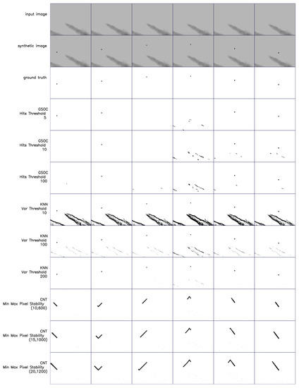 There is a lot of work on comparing background estimation algorithms, but it should be noted that they require empirical evaluation. Thus, the results are dependent on the video sequences or individual images used [32]. Evaluation of the algorithms can be performed with real videos or synthetically generated sequences. In the case of synthetically generated video sequences, various models can be used to control the experiments to a much greater degree than for the real data [33]. In the work of [33], for example, the database of [24] algorithms was used. Background estimation algorithms can be tuned manually [33] by selecting the coefficients or by automatically using an optimization algorithm.