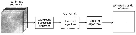 In this approach, we consider the selection of the background estimator for the tracking system, not the tracking system as a whole. Thresholding aims to define the criteria for selecting an algorithm and selecting coefficients. The selected algorithm along with the coefficients can then be used in the tracking system. With conventional tracking systems, the selected thresholding is still used and the data is passed to a tracking algorithm such as a Kalman filter (Figure 9). In the case of TBD systems, thresholding may be used, but it will reduce the tracking abilities. A much better solution is to omit thresholding so that the raw data (output of background subtraction algorithm) is processed by the TBD algorithm in accordance with the tracking-before-detection concept.