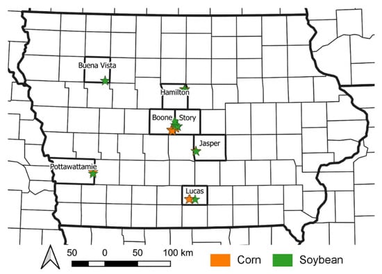 | Woodruff | Story | 41.992, −93.694 | Soybean | 2019 | 4.5 ± 1.3 | 156/298 |