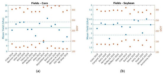 Average per-field yield values as well as planting and harvest dates are shown in Figure 2. The average yield for corn was 12.1 t/ha and varied from 9.6 t/ha to 13.6 t/ha and for soybean was 3.9 t/ha and varied from 2.4 t/ha to 4.5 t/ha. On average, corn and soybean were planted on 4 May (day of year (DOY) 124) and 23 May (DOY 143). They were harvested on 30 October (DOY 303) and 22 October (DOY 295), respectively. Figure 3 shows an example of within-field yield distribution for Coles corn and soybean fields in 2019.