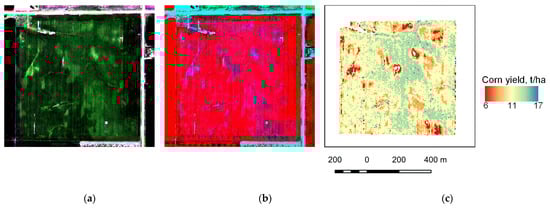 Example of WorldView-3 (WV-3) images acquired over the Coles corn field on 2 July 2018. True color composite red-green-blue (a); false color composite near infrared (NIR)-red-green (b); corn yields (c). © 2021 DigitalGlobe, Inc., a Maxar company, NextView License.