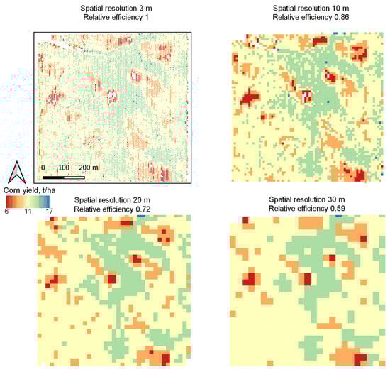 Figure 5 shows the effect of spatial resolution on capturing within-field yield variability using a corn field as an example. These results show the difference between high spatial resolution data compared to moderate spatial resolution of 10–30 m. For example, only 59% of yield variability can be explained with 30 m, while the rest is lost because of coarsening and mixture effects inside the 30 m pixel.