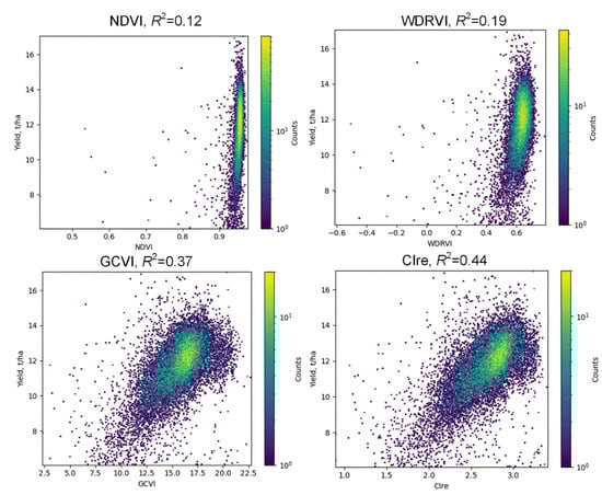 Dependencies between corn yields and NDVI, WDRVI, GCVI, and CIre as derived from the WV-3 imagery acquired on 21 July 2018, 66 days after the planting date. Number of samples is 17,802.