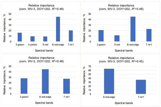 Not all spectral bands were equally important in explaining corn and soybean variability. Figure 8 shows performance of various models and relative importance of spectral bands. Results suggest that, during the stage of corn development when a WV-3 image was taken, in this case, 66 days after planting, the red-edge (0.726 µm), the green (0.552 µm), and the NIR (0.831 µm) bands were the most important in explaining yield variance at field scale. These are in accordance with results obtained for VIs, when red-edge and green-based indices outperformed red-based indices.